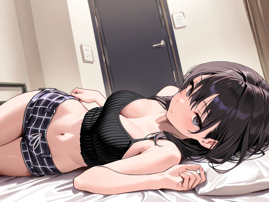 黒いニットに、タータンチェックの短パン。